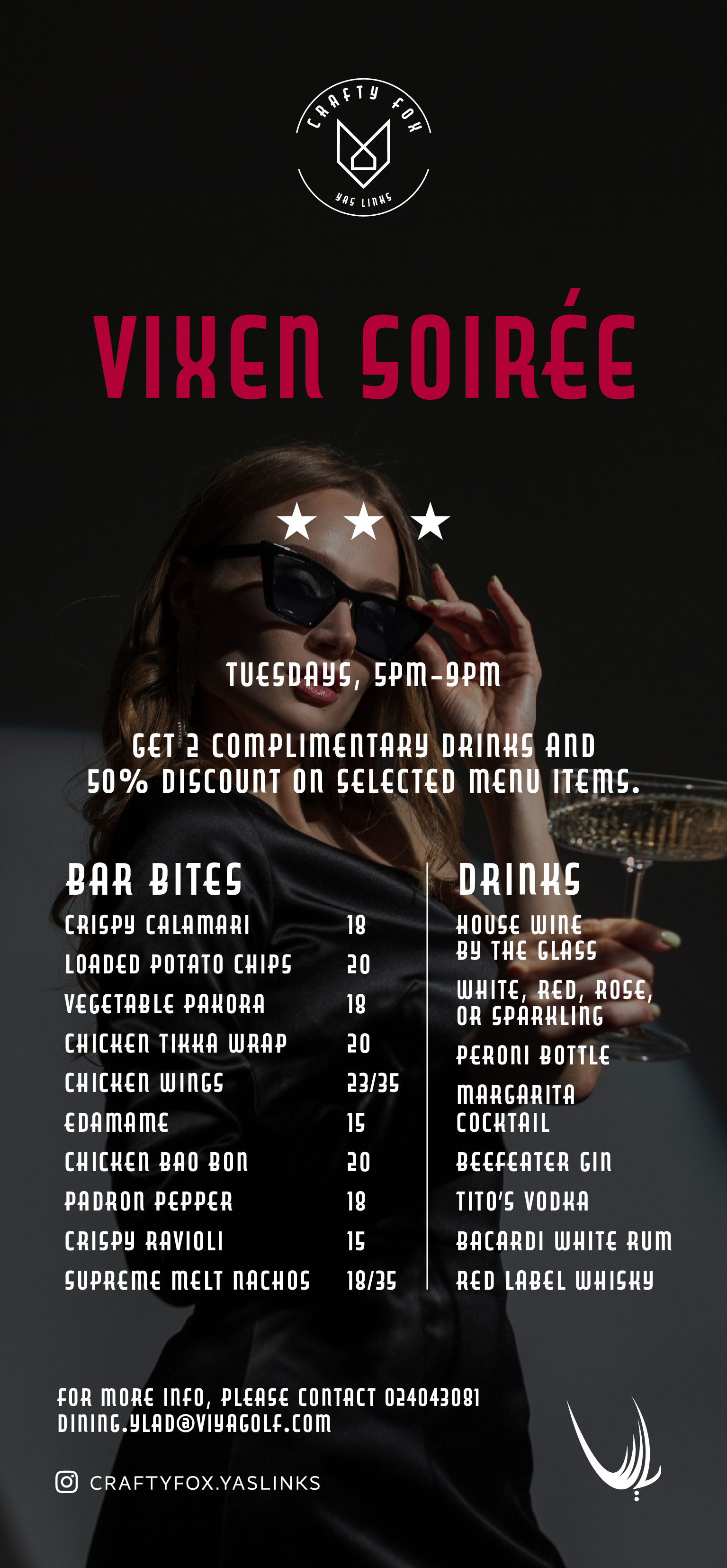 Ladies, your midweek treat awaits. Join us for Vixen Soirée and enjoy two selected beverages along with 50% off a range of curated menu favourites. Whether it's a relaxed catch-up or a stylish evening out, Crafty Fox is the place to be.